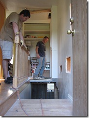 In this corner between the reading room and my bedroom, a few more walls came out. This picture is looking from the reading room through what used to be the door-to-nowhere. You can see the bathroom straight ahead. The first time Ian walked into the gutted bathroom he looked around confused and asked, “Now, what room was this again?”